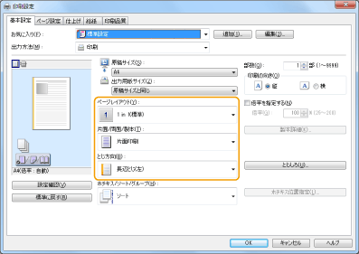 3 | プリントイメージを見ながら、[ページレイアウト] [配置順] [片面/両面/製本] [とじ方向]の順に設定する ![]() |