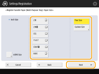 Press <Preferences>  <Paper Settings>  <Register Favorite Paper (Multi-Purpose Tray)>.
