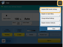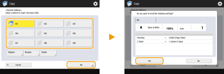 The limit to the number of <Favorite Settings> you can register is as follows. Copy: 9 Fax: 18 Scan and Send: 18 Scan and Store (Mail Box): 9 Scan and Store (Advanced Box/Network/Memory Media): 9 Access Stored Files (Mail Box): 9 JPEG/TIFF files in Access Stored Files (Advanced Box/Network/Memory Media): 9 PDF/XPS files in Access Stored Files (Advanced Box/Network/Memory Media): 9 The cascade copy settings stored in <Previous Settings> or <Favorite Settings> are changed to the local copy settings when the machine or the cascade copy printer is restarted. If you want to recall <Previous Settings> and perform cascade copying, turn ON the main power of the machine, and update the information for the cascade copy printer after the time set in <Waiting Time for Connection at Startup> has elapsed. <Cascade Copy Communication Timeout> |
