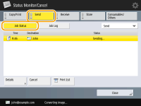 Specifying/registering destinations from the send historyYou can specify destinations and register destinations to the address book from the send history on the <Status Monitor/Cancel> screen. This saves you the effort of directly entering the address, and also helps avoid sending to an incorrect destination due to entering the wrong address. When specifying a destination: <Status Monitor/Cancel> <Send> <Job Log> select the destination to send to <Specify as Send Destination> <OK> When registering a destination: <Status Monitor/Cancel> <Send> <Job Log> register the destination from the registration screen for each destination type |