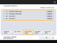 Press <Monitoring Service> <Communication Test> to check communication with the remote monitoring server. When this function is executed, information on the machine is periodically sent to the remote monitoring server. It is necessary to enable communication between the machine and the server providing the service in order to use this function.You can print a list that shows the number of pages used for copying, printing, scanning, and faxing. On this screen, you can also check the counter information for each MEAP application. Press <Check MEAP Counter> on the screen in step 2. If you press <Device Info./Other> <Check Device Configuration> on the same screen, you can check the options installed in the machine and the version of the security chip regarding HDD data encryption.For information on the count conditions, contact your local authorized Canon dealer. |