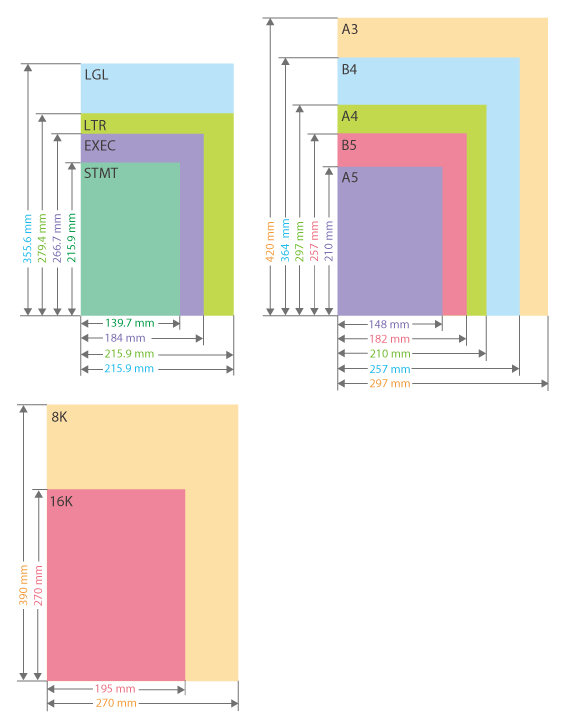 "A4R", "A5R", "B5R", "LTRR" et "STMTR" désignent, respectivement, les formats A4 / A5 / B5 / LTR / STMT chargés en orientation paysage. |
