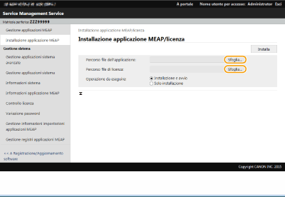 In base all'applicazione MEAP, è possibile scaricare il manuale dell'utente o il relativo software dal seguente URL: http://canon.com/fau/downloads. È possibile aggiornare la versione dell'applicazione MEAP durante la procedura di installazione. Interrompere l'applicazione MEAP sulla schermata SMS prima dell'installazione. Gestione delle applicazioni MEAP Lo spazio massimo su disco rigido utilizzabile dalle applicazioni è di circa 4 GB. Se la macchina esegue il processo di spegnimento durante l'installazione di un'applicazione, potrebbe venire visualizzato un messaggio di errore nella pagina di installazione di SMS e l'installazione venire annullata. In questo caso, provare a installare di nuovo l'applicazione MEAP dopo il riavvio della macchina (spegnere e riaccendere attraverso l'interruttore principale). Per istruzioni su accensione/spegnimento della macchina, vedere Spegnimento della macchina, Accensione della macchina. |