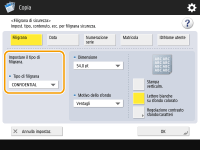 Quando si copiano documenti che contengono informazioni riservate, è possibile incorporare del testo invisibile come "TOP SECRET" o "RISERVATO" per avvisare gli utenti non autorizzati di non copiarli. Quando si copia un documento che è già stato copiato, il testo incorporato compare in tutta la pagina, impedendo copie non autorizzate delle copie. Opzioni di sistema