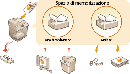Il disco rigido installato in questa macchina possiede uno "spazio di memorizzazione" per salvare, condividere e modificare i documenti acquisiti. Se si collega il supporto di memoria alla macchina, è possibile avere uno spazio di memorizzazione esterno. Trovare e utilizzare lo spazio di memorizzazione ideale in base alle proprie esigenze.