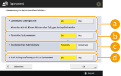 <Nach Auftragsausführung zurück zu Expressmenü>Wenn Sie dies auf <Ein> festlegen, wird das Expressmenü nach der Ausführung eines Auftrags angezeigt. Wenn Sie dies auf <Aus> festlegen, wird die Funktion erneut angezeigt, die vor dem Ausführen eines Auftrags verwendet wurde.