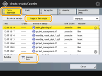 (Monitor estado/Cancelar) aparece la pantalla Monitor de estado/Cancelar, que le permite consultar el historial de uso de cada función, tales como copia, impresión, envío por correo electrónico, envío/recepción de faxes/I-faxes, guardar archivos en "Espacio avanzado", etc. Desde esta pantalla, también puede imprimir el historial de uso para cada función.![]() |
