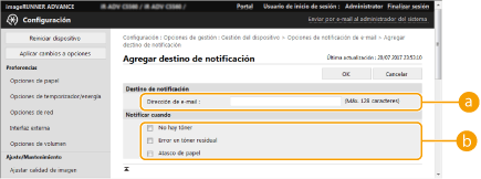 Haga clic en [Gestión del dispositivo] [Opciones de notificación de e-mail]  [Agregar destino de notificación...].