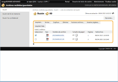 Puede utilizar la IU remota para imprimir, enviar o eliminar archivos almacenados en el Buzón de correo, o faxes e I-faxes que se han almacenado temporalmente en el Buzón de fax/I-fax.
