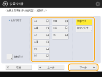 1 | 按<自定义尺寸>。 ![]() 您可以将纸张尺寸指定为 <任意尺寸>,这样就不必再输入纸张尺寸设置。在添加未知尺寸的纸张用于复印时或纸张尺寸已经在打印机驱动程序中注册时指定 <任意尺寸>。 |