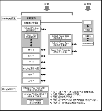 利用“打印机设置”菜单可以访问常规功能。下面是“打印机设置”菜单结构的简化框图。