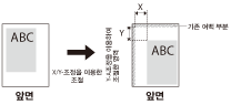 앞면의 인쇄 위치를 수직 또는 수평 방향으로 조정하여 설정값에서 지정한 값에 맞춥니다.