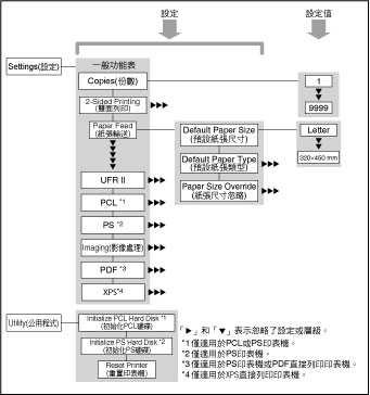 利用「印表機設定」功能表可以存取一般功能。下面是「印表機設定」功能表結構的簡化框圖。