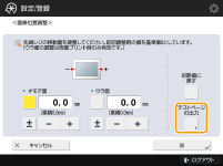 <画像位置調整>画面で、用紙の縁に指標の中央のラインが合うように、<オモテ面>に<->、<+>で数値を入力する