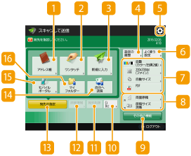 組み合わせによっては同時に設定できない機能があります。設定できないボタンは薄いグレーで表示されます。 画面右上に、指定した宛先の総数が表示されます。 |