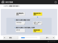 本機のセキュリティーを高めるために、ユーザー認証を使用する体制で運用してください。 ![]() ![]() <ユーザー認証を使用>の<ON>を押して使用するログイン方法の<ON>を押し、<次へ>を押します。 ユーザー認証を使用しない場合は、<ユーザー認証を使用>の<OFF>を押したあと<OK>を押し、Step 5へ進みます。 ![]() 本機に「Administrator」ユーザー以外に管理者が登録されていない場合は、次の設定を行います。 ![]() 本機のセキュリティーを高めるため、新規に管理者を登録して「Administrator」ユーザーを無効にする場合は、<はい>を押します。<管理者ユーザーの登録>で<ユーザー名>、<パスワード>を押してそれぞれ入力し、<OK>を押します。必要に応じて<Eメールアドレス>、<部門ID>、<表示名>を設定してください。詳しくは、ローカルデバイスにユーザー情報を登録するを参照してください。「Administrator」ユーザーは次回ログイン時から無効になります。 「Administrator」ユーザーで運用する場合は、<いいえ>を押します。 ![]() ![]() ログイン画面を表示するタイミングを選びます。<機能選択時に表示>を選んだ場合は、<ファンクション>を押して、ログイン画面を表示させる機能を選び、<OK>を押します。また、<設定/登録>画面でどの項目を設定するときにログイン画面を表示させるかを選びます。 <シンプルログイン>と<キーボード認証>を<OFF>にした場合は、<OK>を押します。Step 5へ進みます。 <シンプルログイン>または<キーボード認証>を<ON>にした場合は、<次へ>を押します。 ![]() ![]() ログイン画面でテンキー入力のみによる認証を使用する場合は、<ON>を押します。 <シンプルログイン>を<OFF>にした場合は、<OK>を押します。Step 5へ進みます。 <シンプルログイン>を<ON>にした場合は、<次へ>を押します。 ![]() ![]() シンプルログインで暗証番号の入力を強制したい場合は<ON>/強制しない場合は<OFF>を押し、<次へ>を押します。 ![]() ![]() プリント機能に適した状態でシンプルログインを使用したい場合は、<ON>を押します。強制留め置き印刷が有効になり、パソコンからの印刷データを利用してユーザー登録したり、プリントするユーザーに適したログイン画面をデフォルト表示にしたりする設定になります。詳しくは、強制留め置き印刷の設定をする、<ユーザーの登録方法>、<シンプルログイン画面のデフォルト表示の変更>を参照してください。 ![]() ![]() シンプルログイン画面のプリセットボタン数を選び、<OK>を押します。 本機はログインサービスにUser Authentication(個人認証管理)を使用する設定になっています。詳しくは、個人認証管理を開始するを参照してください。 | |