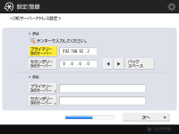 DNSサーバーアドレスやDNSのホスト名/ドメイン名などを設定します。 ![]() ![]() <プライマリーDNSサーバー>、<セカンダリーDNSサーバー>を押して、DNSサーバーのIPv4/IPv6アドレスを入力し、<次へ>を押します。 DNSサーバーアドレスの設定などについて詳細は、DNSの設定をするを参照してください。 ![]() ![]() <ホスト名>を押して本機の名称(ホスト名)を、<ドメイン名>を押して本機が属するネットワークドメイン名を入力し、<次へ>を押します。 IPv4とIPv6が同じ設定になる場合は、<IPv4と同じホスト名/ドメイン名を使用>の<ON>を押してください。 ![]() ![]() DNSの動的更新で自動登録する場合は、<DNSの動的更新>を<ON>にして、<OK>を押します。 <IPv6>の<DNSの動的更新>を<ON>にした場合は、自動登録する項目を<ON>にします。 | |