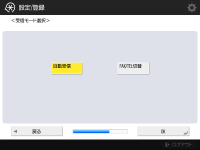 ファクス機能を使うために必要な設定を行います。 ![]() ファクスに必要なオプション(システムオプションについて)が装着されていない場合はStep 10に進みます。 ![]() ファクス番号を入力し、<次へ>を押します。 ファクスの設定について詳しくは、ファクスの設定をするを参照してください。 ![]() ![]() <設定>を押してユーザー略称を入力し、<次へ>を押します。 ![]() ![]() 回線種類を選び、<次へ>を押します。 ![]() ![]() ファクス機能のみ使う場合は<自動受信>、電話機やハンドセットを接続しているときは<FAX/TEL切替>を押し、<OK>を押します。 | |