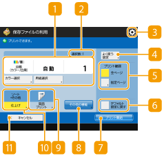 メインメニューの<保存ファイルの利用>を押したあと、<ボックス>、<アドバンスドボックス>、<ネットワーク>、<メモリーメディア>のいずれかを押してファイルをプリントしようとすると、次の設定画面が表示されます。