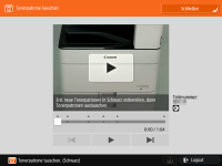 Im Gerät befindet sich noch etwas Toner, aber dieser reicht nicht mehr lange. Drücken Sie das Symbol in der rechten unteren Ecke des Bildschirms, um das Video zum Vorgehen beim Austauschen der Tonerpatrone aufzurufen. Befolgen Sie zum Austauschen des Tonerbehälters die Anweisungen im Video.