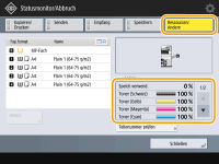 drücken, wird der Bildschirm Status Monitor/Abbruch angezeigt, auf dem Sie den Tonerstand, den im Alttonerbehälter verbliebenen freien Platz und die verbliebene Menge von Heftklammern und Sattelheftklammern überprüfen können.