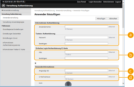 Sie können ebenfalls Benutzerinformationen registrieren, indem Sie   <Einstellungen Verwaltung>  <Anwenderverwaltung>  <Verwaltung Authentisierung>  <Authentisierten Anwender speichern/bearbeiten> drücken. <Authentisierten Anwender speichern/bearbeiten>