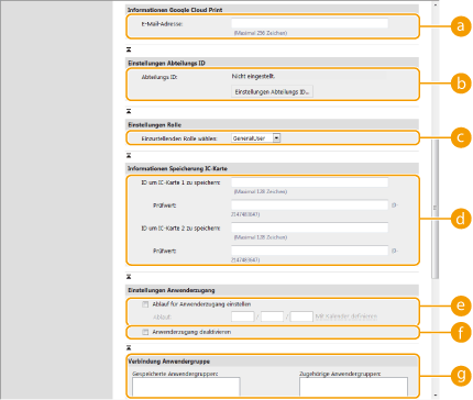 Wenn [Einstellungen/Speicherung] [Einstellungen Netzwerk] [Einstellungen Druck Google Cloud] aktiviert ist, kann für die Verbindung mit Google Cloud Print eine Google Cloud Print-E-Mail-Adresse angegeben werden.