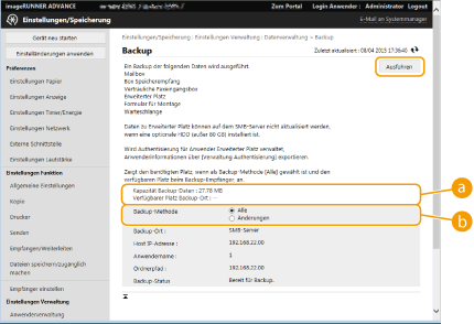 [Kapazität Backup-Daten]/[Verfügbarer Platz Backup-Ort]
