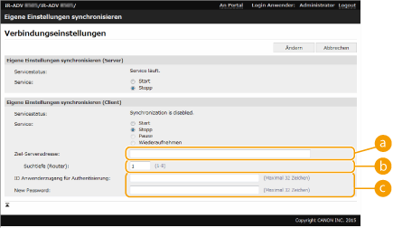 Drücken Sie <Einstellungen Verwaltung> <Geräteverwaltung> stellen Sie <Eigene Einstellungen synchronisieren (Client)> auf <Aktivieren>.Wird das Gerät als Server-/Clientgerät verwendet, stellen Sie außerdem <Eigene Einstellungen synchronisieren (Client)> auf <Aktivieren>.