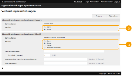 Wenn der Dienst zum Synchronisieren der benutzerdefinierten Einstellungen auf dem Servergerät gestartet wird (ist das Gerät ein Server-/Clientgerät, kann die Einstellung durch gleichzeitiges Starten des Server- und des Clientdiensts geändert werden)
