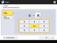 Wenn Sie bei beidseitigen Kopien das Bild auf der Rückseite verschieben möchten, ist die Einstellung <Rückseite> erforderlich. Um das Bild an dieselbe Position wie auf der Vorderseite zu verschieben, drücken Sie <Wie Vorderseite>. Um das Bild symmetrisch zu verschieben, drücken Sie <Entgegengesetzt zur Vorderseite>. Um das Bild an eine andere Position als auf der Vorderseite zu verschieben, drücken Sie <Einstellen>, und geben Sie die Verschiebungsentfernung ein.