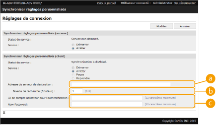appuyez sur <Réglages de gestion> <Gestion du périphérique> définissez <Synchroniser réglages personnalisés (client)> sur <Activer>.Si la machine est utilisée comme serveur/client, réglez aussi <Synchroniser réglages personnalisés (client)> sur <Activer>.