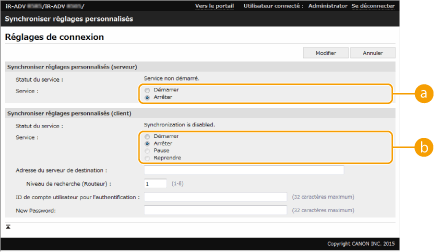 Lorsque le service pour la synchronisation des réglages personnalisés est démarré sur le serveur (si la machine est un serveur/client, le réglage peut être modifié en démarrant le service serveur et le service client en même temps)