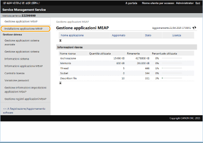 È possibile controllare il numero di applicazioni installate e lo spazio del disco rigido utilizzato. Gestione delle applicazioni MEAP