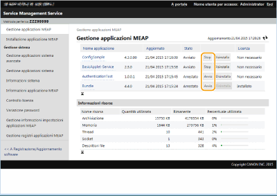 Fare clic su [Avvio] / [Stop] per l'applicazione MEAP da utilizzare.