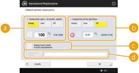 <Impostazioni gestione> <Gestione periferiche> <Impostazioni distribuz.informazioni periferica> <Registro comunicazione> <Stampa elenco> <Sì>.Quando si imposta la stampa di un rapporto all'ora specificata