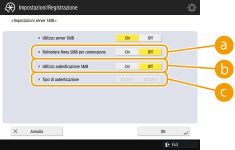 Selezionare <On> in <Utilizzo server SMB> ed eseguire le impostazioni necessarie.