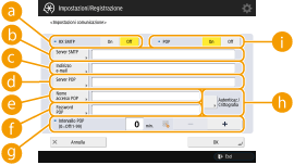 ![]() <Autenticazione SMTP (AUT. SMTP)>Per usare l'autenticazione SMTP, premere <On>, inserire il nome utente e la password degli account di posta specificati in <Nome utente> e <Password>.