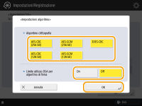 Se si imposta <Standardizz. metodo crittogr. su FIPS 140-2> su <On>, è possibile rendere il metodo di crittografia della comunicazione TLS conforme agli standard FIPS (Federal Information Processing Standards) 140-2 approvati dal governo degli Stati Uniti. <Standardizz. metodo crittogr. su FIPS 140-2>