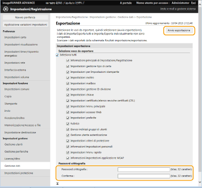 Viene richiesta la password in [Password crittografia] ogni volta che vengono importati i dati di impostazione esportati. Utilizzare caratteri alfanumerici.