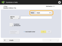 Se si desidera impostare la macchina in modo da poter controllare il risultato dell'invio di un documento sulla schermata <Monitoraggio stato/Annulla>, selezionare <Pieno>. Diversamente, selezionare <Semplici>. Non dimenticare che anche il destinatario deve supportare la modalità di trasmissione per poter controllare il risultato dell'invio. In base alla macchina del destinatario, l'invio di un I-fax è consentito solo se si seleziona <Semplici>.