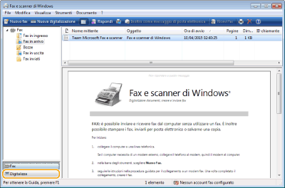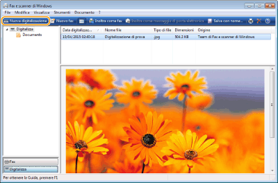 Quando la scansione è completa, il documento acquisito è visualizzato nell'elenco dei file della schermata [Fax e scanner di Windows] e salvato nella cartella [Documenti digitalizzati] di [Documento].