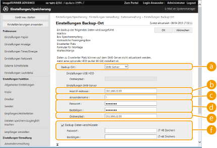 [Kapazität Backup-Daten]/[Verfügbarer Platz Backup-Ort]