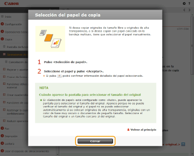 Al hacer clic en el icono, puede oscurecerse la página actual y aparecer una ventana emergente. Para volver a la páginas, haga clic en [Cerrar] en la ventana emergente.
