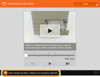 El depósito de tóner residual está casi lleno. Puede seguir con su trabajo de impresión pero debe tener un nuevo depósito a mano para que pueda proceder a su sustitución cuando se requiera. Si decide sustituirlo cuando aparezca el mensaje, pulse el icono que encontrará en la esquina inferior derecha de la pantalla y siga las instrucciones que aparecerán en pantalla para proceder a la sustitución.