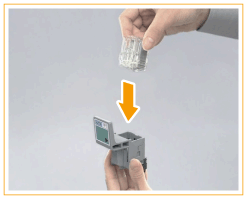 Inserte la pestaña trasera de la caja de grapas en el cartucho de grapas y, a continuación, baja la caja de grapas para fijarla.