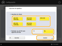 Su configura <Establ. método de cifrado como FIPS 140-2> como <Sí>, hará que el método de cifrado de comunicación TLS cumpla con los FIPS (Estándares Federales de Procesamiento de la Información) 140-2 aprobados por el gobierno de Estados Unidos.<Establ. método de cifrado como FIPS 140-2>