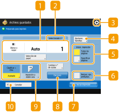 Al pulsar <Archivos guardados> en el Menú principal y luego pulsar <Buzón>, <Espacio avanzado>, <Red> o <Dispositivo de memoria> para imprimir archivos, aparece la pantalla de configuración siguiente.
