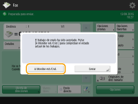 <Informe de TX> puede configurar que se imprima automáticamente el informe con la lista de resultados del envío.Cuando se introducen múltiples hojasSe detendrá el escaneado y aparecerá el mensaje en pantalla. Siga las instrucciones para eliminar el atasco. Cuando haya eliminado el atasco, aparecerá la pantalla de reanudación de trabajo. Si el equipo detecta erróneamente alimentación múltiple de hojas, pulse <No detectar alimentación de varias hojas> para reanudar el escaneado.