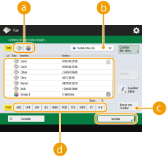 Para consultar los estados de los documentos enviadosEn la pantalla <Monitor estado/Cancelar>, puede consultar los estados de los documentos enviados. En esta pantalla puede volver a enviar faxes o cancelar el envío tras consultar los estados. Comprobación del estado y el registro de los documentos enviados y recibidos